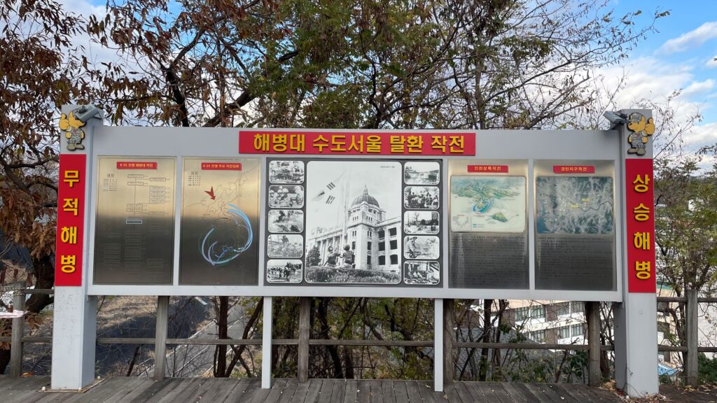 전적비가 있다는 그곳에 오르면 왼쪽에 있는 비석보다는 오른쪽에 있는 설명을 먼저 가보게 된다. ‘무적해병’이라고 되어 있는 화려한 색에 끌려간 것인지, 설명을 먼저 본 뒤에 비석을 보려는 모범적인 순서를 위함인지, 오른쪽이 좀 더 익숙한 탓인지 설명대에 서서 처음 보게 되는 것은 ‘6.25 전쟁 해병대 작전’이라는 제목의 작전 흐름도이다.