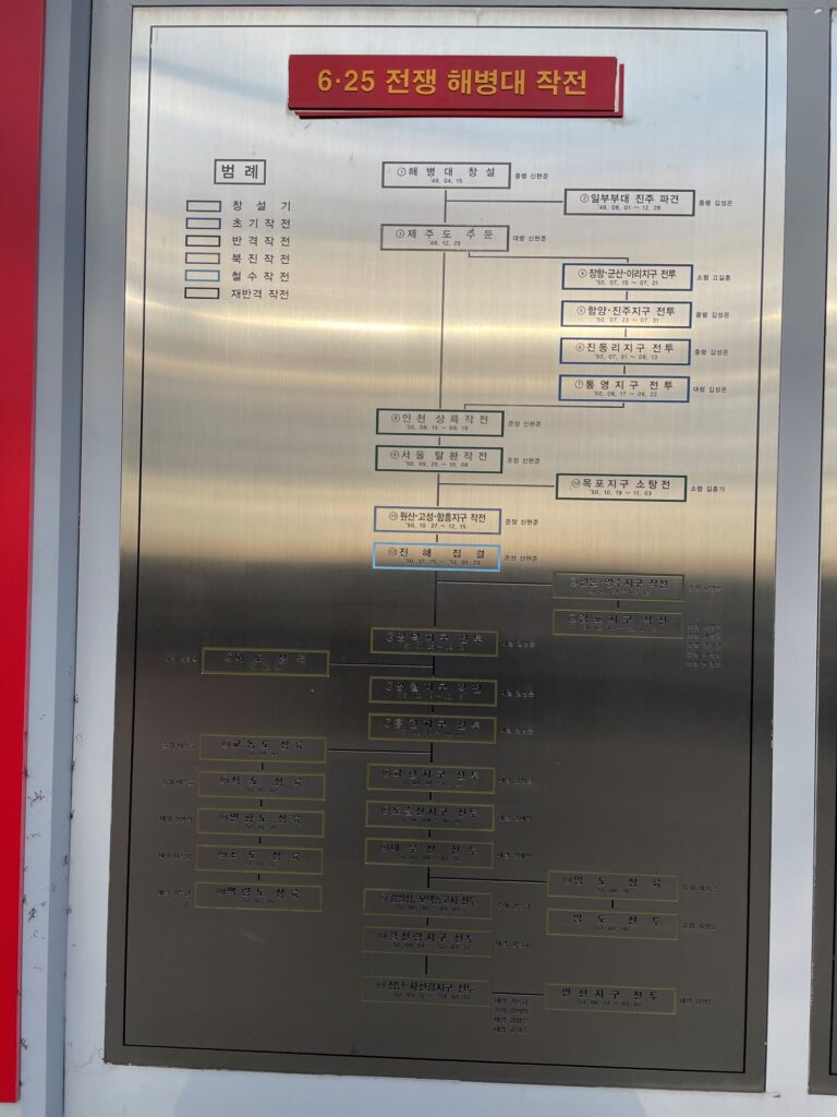 전적비가 있다는 그곳에 오르면 왼쪽에 있는 비석보다는 오른쪽에 있는 설명을 먼저 가보게 된다. ‘무적해병’이라고 되어 있는 화려한 색에 끌려간 것인지, 설명을 먼저 본 뒤에 비석을 보려는 모범적인 순서를 위함인지, 오른쪽이 좀 더 익숙한 탓인지 설명대에 서서 처음 보게 되는 것은 ‘6.25 전쟁 해병대 작전’이라는 제목의 작전 흐름도이다.